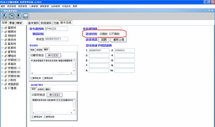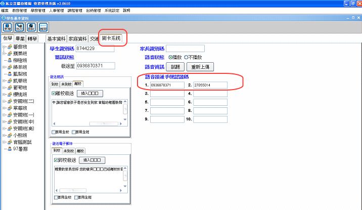 (六)新增小朋友資料 (刷卡系統) - 語音接通手機認證碼 (最多可設定十組電話號碼)