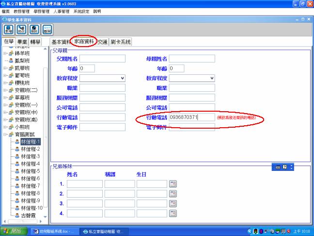 (五)教務管理學生基本資料:新增家庭資料 行動電話